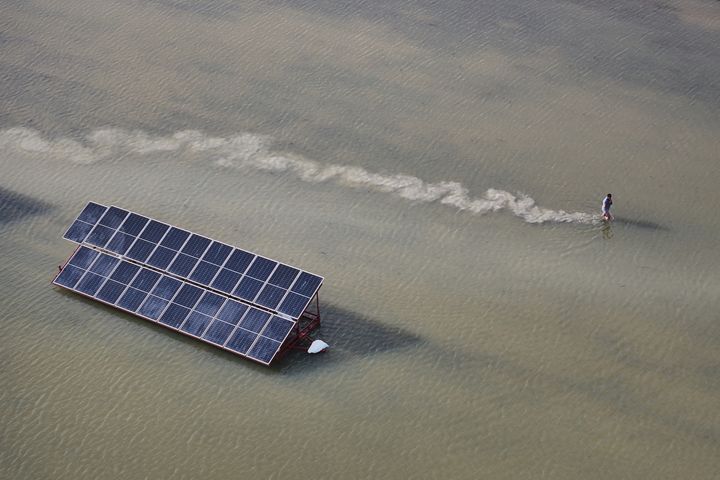[흐메이마트 알 데이르=AP/뉴시스] 25일(현지 시간) 시리아 북서부 흐메이마트 알 데이르(Hmeimat al-Deir)의 알 시하 댐 수위가 폭우로 상승한 가운데, 한 남성이 물에 잠긴 농경지와 태양광 패널 사이를 걸어가고 있다. 이번 홍수로 인근 마을과 농경지가 침수 피해를 입었다. 2026.04.26.