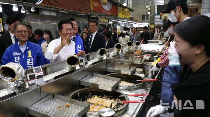 [단양=뉴시스] 이병찬 기자 = 26일 충북 단양 구경시장을 찾은 더불어민주당 정청래 대표가 상인들에게 손 인사를 하고 있다. 이날 정 대표의 현장 방문에는 같은 당 신용한 충북지사 후보와 김광직 단양군수 후보가 동행했다[email protected]