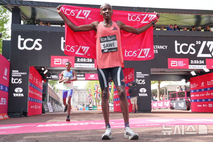 [런던=AP/뉴시스] 사바스티안 사웨(케냐)가 26일(현지 시간) 영국 런던에서 열린 2026 런던마라톤에서 1시간 59분 30초 세계신기록으로 결승선을 통과한 뒤 기뻐하고 있다. 2026.04.26.