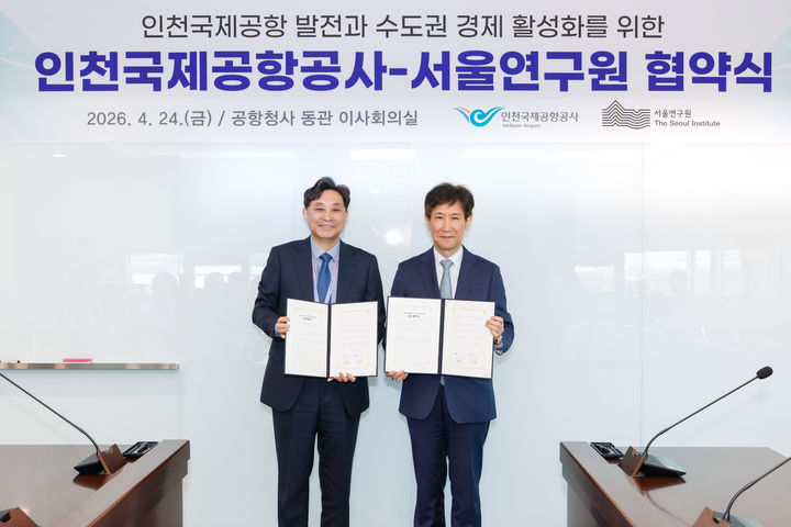 [서울=뉴시스] 송치웅(왼쪽) 공항산업기술연구원장과 서울연구원 오균 원장이 지난 24일 인천국제공항공사 회의실에서 상호협력 및 연구 네트워크 강화를 위한 업무협약 기념촬영을 하고 있다. (사진=인천국제공항공사 제공) 2026.04.26. [email protected] *재판매 및 DB 금지