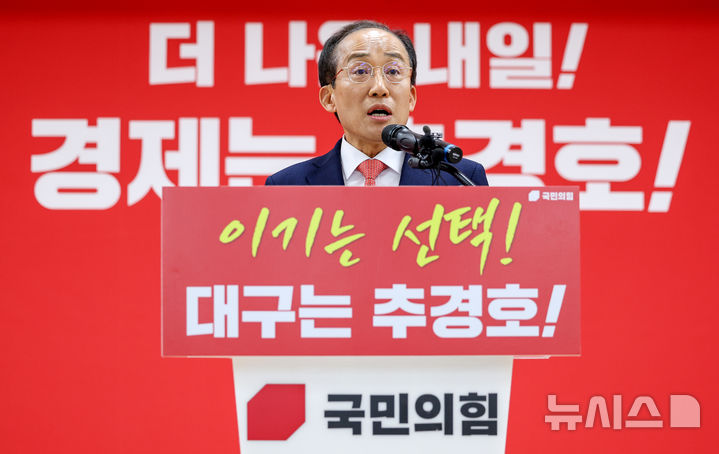 [대구=뉴시스] 이무열 기자 = 6·3 지방선거 국민의힘 대구시장 후보로 확정된 추경호 의원이 26일 대구 수성구 국민의힘 대구시당에서 수락연설을 하고 있다. 2026.04.26. [email protected]