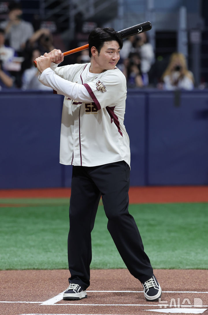 [서울=뉴시스] 홍효식 기자 = 26일 서울 구로구 고척스카이돔에서 열린 2026 KBO 리그 삼성 라이온즈와 키움 히어로즈의 경기에 앞서 은퇴식을 치른 박병호 코치가 시타하고 있다. 2026.04.26. [email protected]