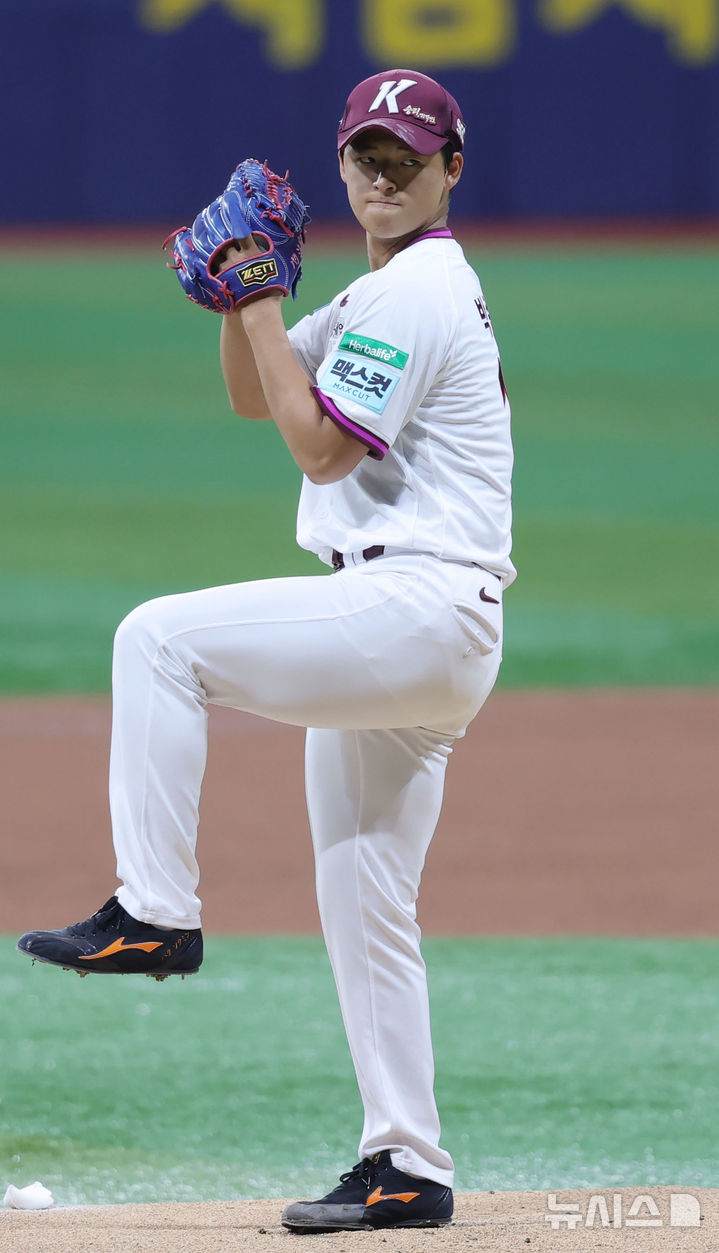[서울=뉴시스] 홍효식 기자 = 26일 서울 구로구 고척스카이돔에서 열린 2026 KBO 리그 삼성 라이온즈와 키움 히어로즈의 경기, 1회초 키움 선발투수 박준현이 공을 던지고 있다. 2026.04.26. [email protected]