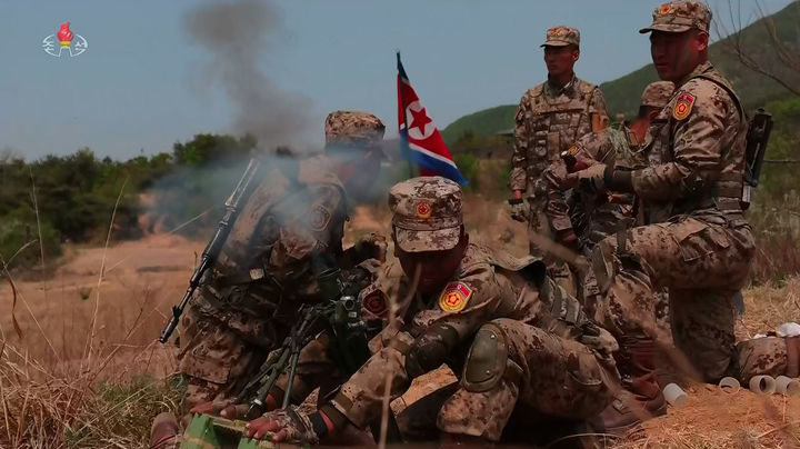 [서울=뉴시스] 김정은 북한 국무위원장이 지난 25일 인민군의 뿌리로 여기는 항일 유격대(빨치산) 조선인민혁명군 창건 94주년을 맞아 조선인민군 각급 대연합부대 관하 경보병부대 박격포병들의 사격경기를 참관했다고 북한 조선중앙TV가 26일 보도했다. (사진=조선중앙TV 캡처) 2026.04.26. [email protected]