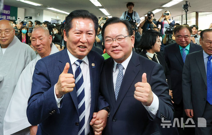 [대구=뉴시스] 이무열 기자 = 정청래 더불어민주당 대표와 김부겸 대구시장 예비후보가 26일 대구 달서구 선거사무소 개소식에서 엄지를 들어 보이고 있다. 2026.04.26. [email protected]