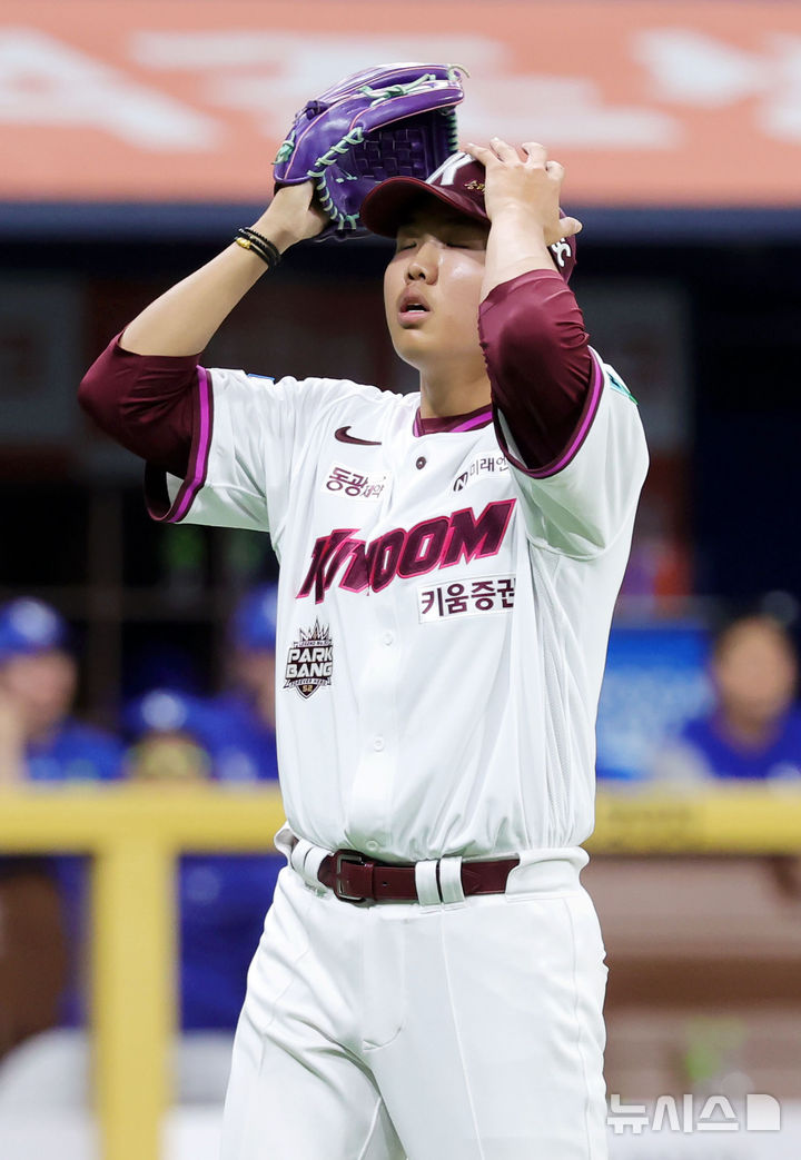 [서울=뉴시스] 홍효식 기자 = 26일 서울 구로구 고척스카이돔에서 열린 2026 KBO 리그 삼성 라이온즈와 키움 히어로즈의 경기, 8회초 2사 1,3루 삼성 강민호의 타격이 땅볼로 송구아웃되자 키움 투수 박정훈이 안도하고 있다. 2026.04.26. [email protected]