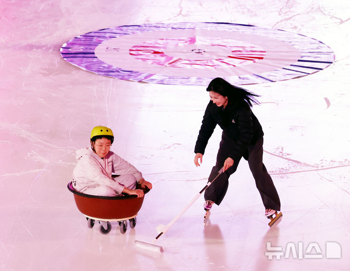 [서울=뉴시스] 박주성 기자 = 쇼트트랙 김길리 선수가 26일 서울 목동 종합운동장 실내 아이스링크에서 열린 ‘한국 빙상의 날 기념행사 K-Skating Day’에서 팬들과 함께 컬링 게임을 하고 있다. 2026.04.26. [email protected]