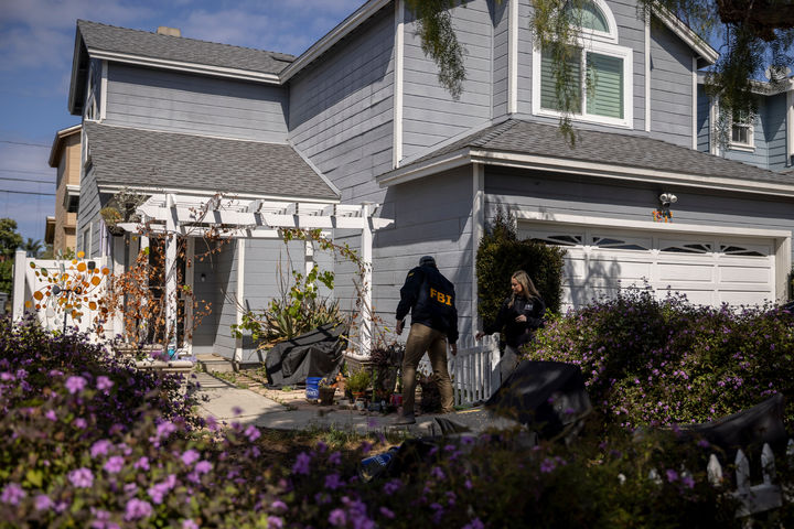 [토런스=AP/뉴시스] 26일(현지 시간) 미 캘리포니아주 토런스에서 미연방수사국(FBI) 요원들이 '백악관 출입기자단 연례 만찬(WHCD)' 총격 사건 용의자로 검거된 콜 토머스 앨런(31)의 거주지 인근 주택을 방문해 조사하고 있다. 수사 당국은 전날 현장에서 검거된 앨런이 캘리포니아에서 워싱턴까지 열차로 이동한 경로와 범행 동기 등을 파악하기 위해 주변 인물들을 대상으로 광범위한 탐문 수사를 하고 있다. 2026.04.27.