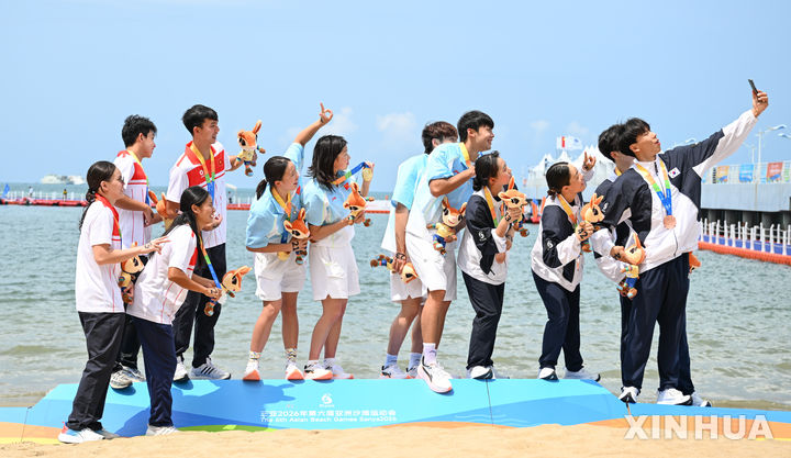 [산야=신화/뉴시스] 한국 오픈워터스위밍 대표(오른쪽) 선수들이 27일(현지 시간) 중국 하이난성 산야에서 열린 '제6회 산야 아시안비치게임'(ABG) 오픈워터스위밍 혼성 단체전 4x1.5㎞ 계주에서 동메달을 따낸 뒤 시상대에 올라 금(중국), 은(베트남) 선수들과 셀카를 찍고 있다. 이 대회 처음으로 출전한 한국은 이날 결승에서 1시간8분15초로 7개국 중 3위를 기록하며 동메달을 획득했다. 2026.04.27.