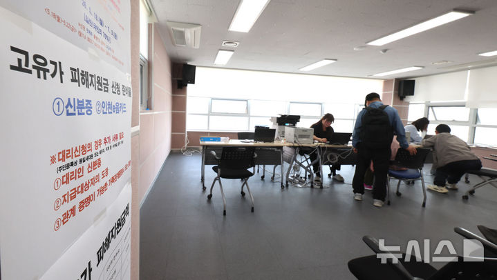 [인천=뉴시스] 전진환 기자 = 고유가 피해지원금 1차 지급이 시작된 27일 오전 인천 미추홀구 도화2동3동행정복지센터에서 시민들이 지원금 신청을 하고 있다. 2026.04.27. [email protected]