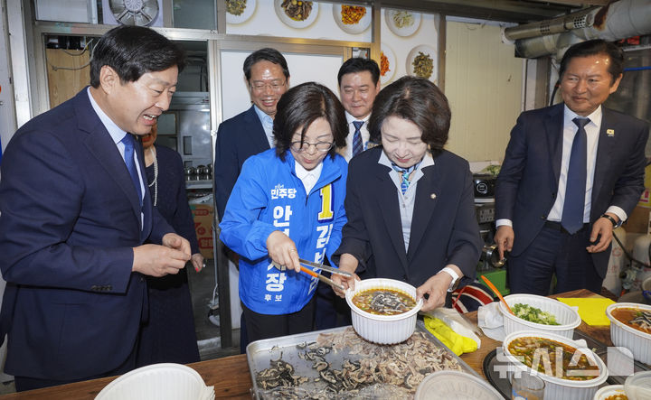 [안성=뉴시스] 김종택기자 = 정청래 더불어민주당 대표가 27일 경기 안성시 중앙시장을 찾아 추미애 경기도지사 후보, 김보라 안성시장 후보와 함께 국거리를 살펴보고 있다. (공동취재) 2026.04.27. [email protected]