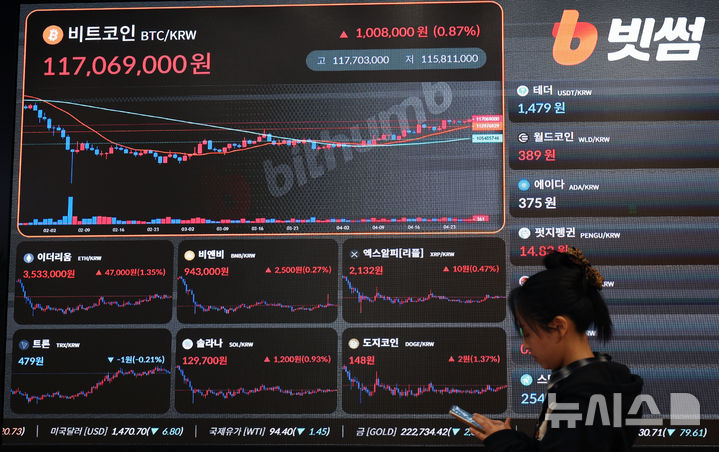 [서울=뉴시스] 김진아 기자 = 비트코인이 상승 흐름을 이어가고 있지만 지정학적 변수에 따른 관망 심리가 이어지는 27일 오후 서울 서초구 빗썸라운지 강남점에 비트코인 시세가 표시되고 있다. 2026.04.27. [email protected]