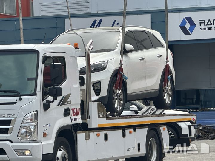 [대전=뉴시스] 김도현 기자 = 대전 안전공업 화재로 피해를 입은 차량이 28일 대전 대덕구 문평동 안전공업 동관 공장에서 인양된 뒤 자동차 운반 차량에 실리고 있다. 2026.04.28. [email protected]