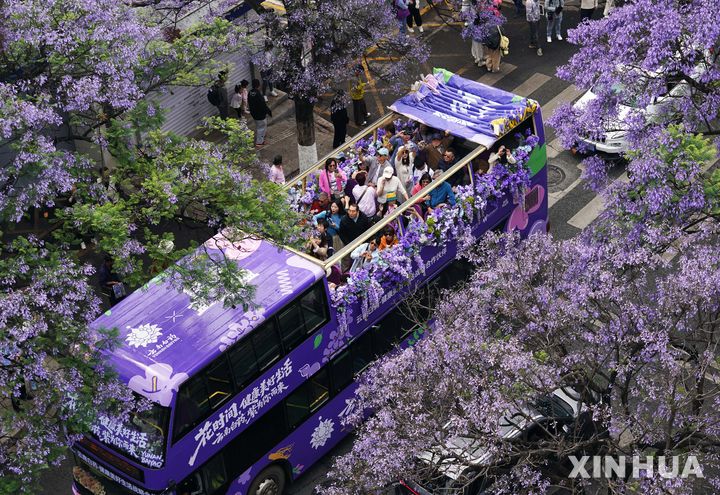 [쿤밍=신화/뉴시스] 지난 26일(현지 시간) 중국 윈난성 쿤밍에서 이층 버스에 탑승한 관광객들이 활짝 핀 자카란다꽃을 감상하고 있다. 매년 이맘때면 쿤밍 시내 곳곳은 보랏빛 자카란다꽃으로 물들어 시민과 관광객들에게 아름다운 봄의 정취를 선사한다. 2026.04.28.