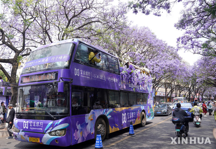 [쿤밍=신화/뉴시스] 지난 26일(현지 시간) 중국 윈난성 쿤밍에서 이층 버스에 탑승한 관광객들이 활짝 핀 자카란다꽃을 감상하고 있다. 매년 이맘때면 쿤밍 시내 곳곳은 보랏빛 자카란다꽃으로 물들어 시민과 관광객들에게 아름다운 봄의 정취를 선사한다. 2026.04.28.