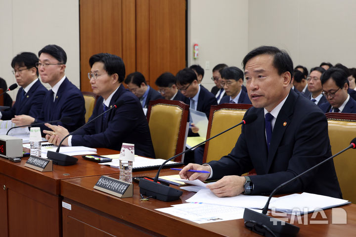 [서울=뉴시스] 고승민 기자 = 김종철 방송미디어통신위원장이 28일 서울 여의도 국회에서 열린 과학기술정보방송통신위원회 전체회의에서 의원 질의에 답하고 있다. 2026.04.28. [email protected]