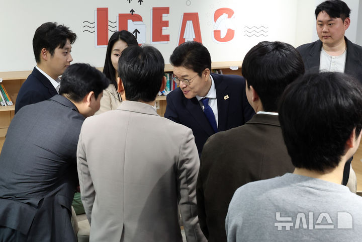 [서울=뉴시스] 최진석 기자 = 정원오 더불어민주당 서울시장 후보가 28일 서울 동대문구 경희대 캠퍼스타운 삼의원창업센터 누리터에서 열린 정원오의 찾아가는 간담회 : 청년기업가 및 예비창업자 편에 참석하며 청년들과 인사하고 있다. 2026.04.28. [email protected]