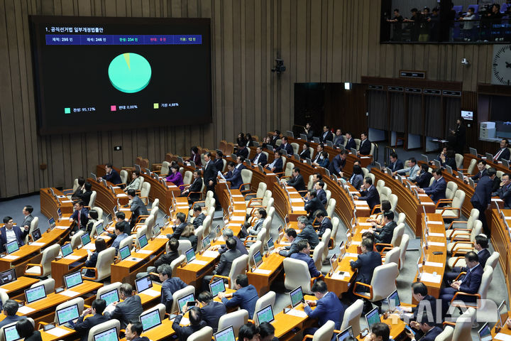 [서울=뉴시스] 김명년 기자 = 28일 오후 서울 여의도 국회에서 열린 제434회국회(임시회) 제8차 본회의에서 공직선거법 일부개정법률안이 가결되고 있다. 2026.04.28. [email protected]
