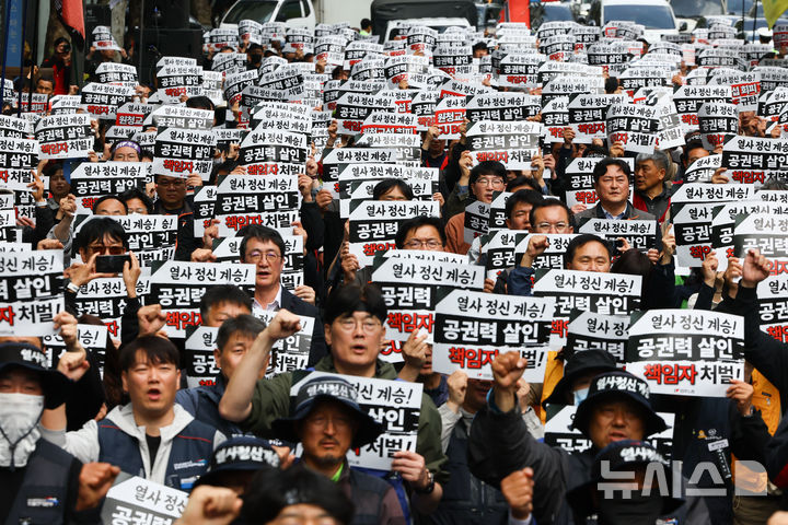 [서울=뉴시스] 황준선 기자 = 전국민주노동조합총연맹 조합원들이 28일 서울 강남구 BGF 리테일 본사 앞에서 열사 정신계승! 공권력 살인 규탄! 원청교섭 회피 CU BGF 규탄! 민주노총 결의대회에서 구호를외치고 있다. 2026.04.28. [email protected]