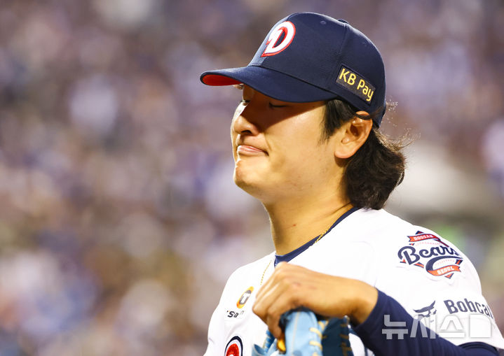 [서울=뉴시스] 황준선 기자 = 28일 서울 송파구 잠실야구장에서 열린 2026 KBO 리그 삼성 라이온즈와 두산 베어스의 경기, 4회 초 2점을 내주며 이닝을 마친 두산 선발 곽빈이 덕아웃으로 향하며 아쉬워하고 있다. 2026.04.28. [email protected]