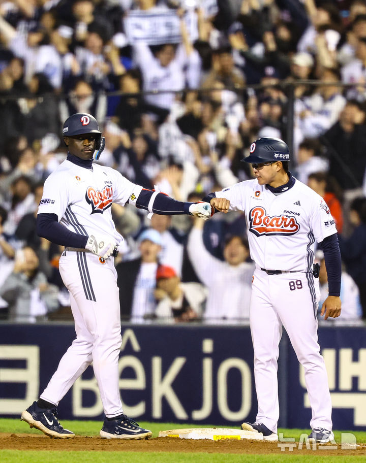 [서울=뉴시스] 황준선 기자 = 28일 서울 송파구 잠실야구장에서 열린 2026 KBO 리그 삼성 라이온즈와 두산 베어스의 경기. 9회말 1사 주자 민루 상황에서 두산 카메론이 동점 2타점 적시타를 치고 기뻐하고 있다. 2026.04.28. [email protected]