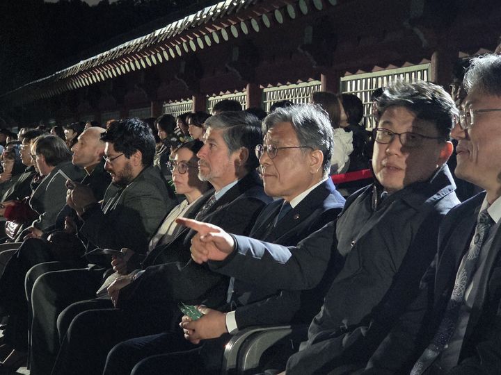 [서울=뉴시스] 김근수 기자 = 허민(가운데) 국가유산청장이 28일 오후 서울 종로구 종묘에서 제례 시 사용되는 기악과 무용을 선보이는 유네스코 인류무형유산 ‘종묘제례악’ 야간공연을 관람하고 있다. (사진= 국가유산청 제공) 2026.04.28. [email protected] *재판매 및 DB 금지