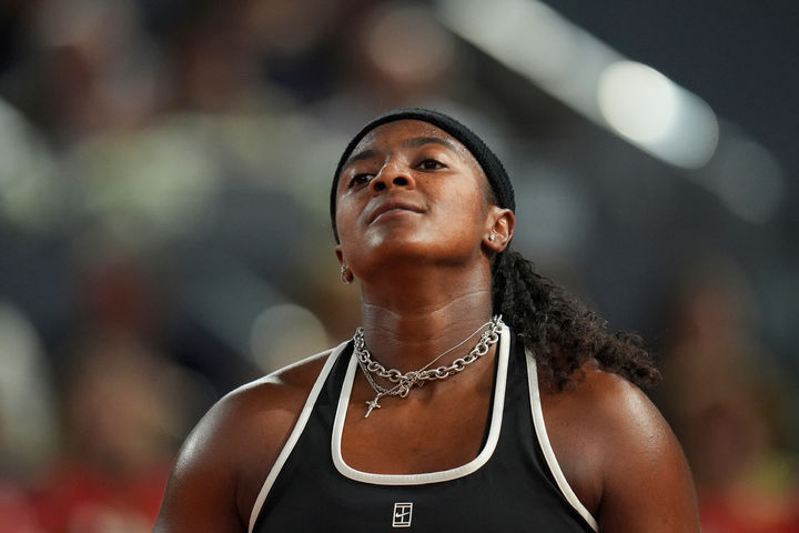 [마드리드=AP/뉴시스] 헤일리 밥티스트(32위·미국)가 28일(현지 시간) 스페인 마드리드에서 열린 WTA 1000 마스터스 무투아 마드리드 오픈 단식 8강전에서 아리나 사발렌카(1위·벨라루스)와 경기하고 있다. 밥티스트가 강력한 우승 후보인 사발렌카에게 2-1(2-6 6-2 7-6) 역전승을 거두고 4강에 올랐다. 2026.04.29.
