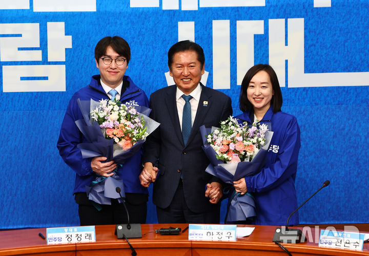[서울=뉴시스] 김명년 기자 = 정청래 더불어민주당 대표가 29일 서울 여의도 국회에서 열린 인재영입식에서 하정우 전 청와대 AI 미래기획수석비서관, 전은수 전 청와대 대변인과 기념촬영하고 있다. 2026.04.29. [email protected]