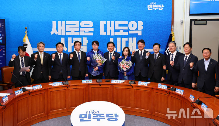 [서울=뉴시스] 김명년 기자 = 정청래 더불어민주당 대표가 29일 서울 여의도 국회에서 열린 인재영입식에서 하정우 전 청와대 AI 미래기획수석비서관, 전은수 전 청와대 대변인 등 참석자들과 함께 기념촬영하고 있다. 2026.04.29. [email protected]
