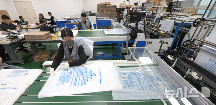 [인천=뉴시스] 전진환 기자 = 중동 전쟁 장기화 여파로 비닐 원료 일부 수급 불안이 커지는 가운데 29일 오후 인천 서구의 장애인 직업재활시설에서 종량제봉투를 생산하고 있다. 2026.04.29. [email protected]