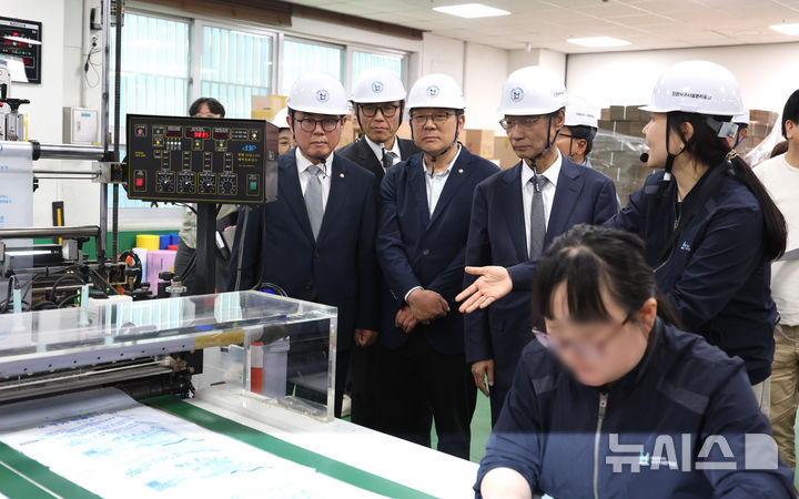 [인천=뉴시스] 전진환 기자 = 더불어민주당 중동전쟁 경제대응특별위원회 유동수(오른쪽 두번째) 위원장과 안도걸 간사, 허종식 의원이 29일 오후 종량제봉투를 생산하는 인천 서구의 장애인 직업재활시설을 찾아 수급상황 현장 점검을 하고 있다. 2026.04.29. [email protected]