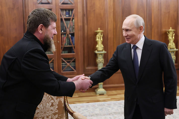 [모스크바=AP/뉴시스] 블라디미르 푸틴(오른쪽) 러시아 대통령이 29일(현지 시간) 러시아 모스크바 크렘린궁에서 람잔 카디로프 체첸 공화국 수장과 만나 악수하고 있다. 2026.04.30.