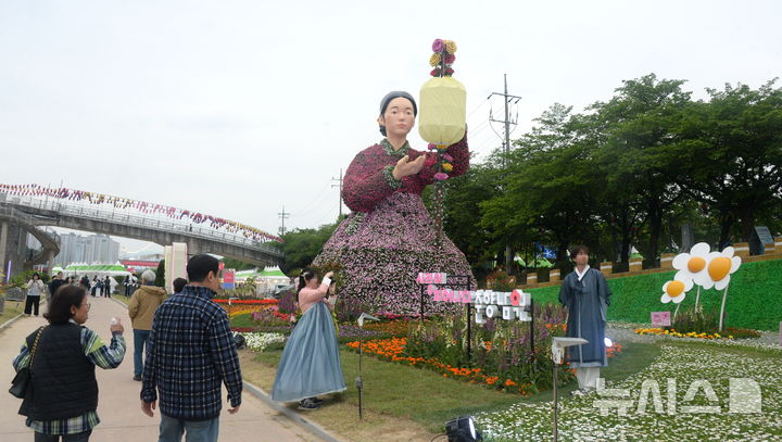 [남원=뉴시스] 김얼 기자 = 제96회 남원 춘향제 개막일인 30일 전북 남원시 요천로에 꽃으로 만들어진 춘향이와 몽룡이 모형이 설치되어 있다. 2026.04.30. [email protected]