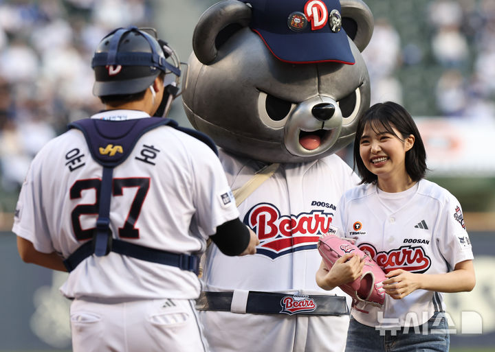 [서울=뉴시스] 최진석 기자 = 30일 서울 송파구 잠실야구장에서 열린 2026 KBO리그 삼성 라이온즈와 두산 베어스의 경기, 배우 최지수가 시구 후 공을 받고 있다. 2026.04.30. [email protected]