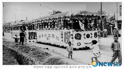 <사진은 1948년 국회개원을 축하하는 꽃장식을 단 전차의 모습이다. 사진제공=국회사무처>