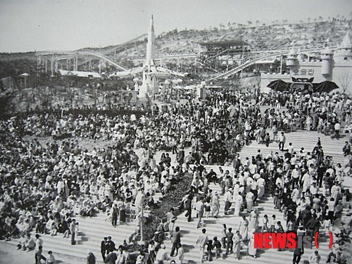 【서울=뉴시스】1976년 용인자연농원 개장식에서 참석자들이 테이프 커팅을 하고 있다. 오른쪽에서 3번째가 이병철 회장이다. (사진=인생은 흐르는물처럼 '담담여수' 서적)  photo@newsis.com