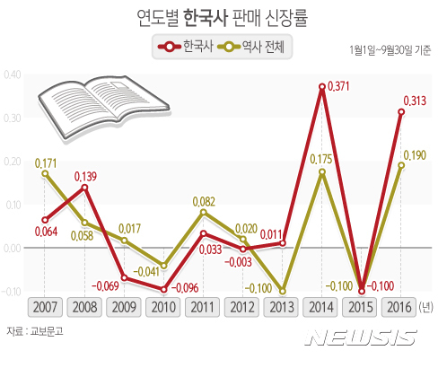 방송에 출연해 화제를 모은 설민석, 무적핑크, 최태성 등을 통해 쉽고 재미있는 역사책들이 큰 인기를 끌면서 한국사 분야의 판매가 급증한 것으로 나타났다. 또 최근 역사적 배경을 다룬 드라마가 방영되고 영화들이 개봉하면서 근현대사를 다룬 신간과 스테디셀러까지도 동반 호조로 보이는 분위기다. 올해 한국사 분야에서는 설민석의 '설민석의 조선왕조실록'이 종합 베스트셀러 7주 연속 1위를 차지하면서 지난해 같은 기간 대비 31.3% 신장한 판매량을 이끌었다. 2014년 유시민의 '나의 한국현대사'의 인기에 힘입어 판매량이 37.1% 신장한 데 이어 두 번째로 높은 신장세를 보였다.