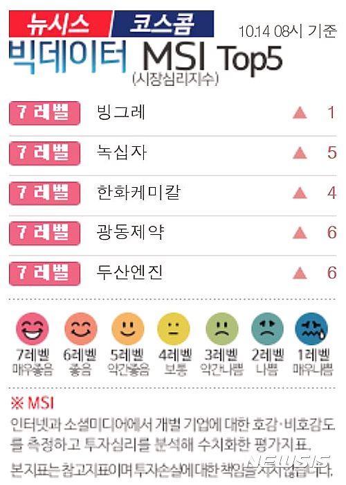 이날 톱5에 선정된 5개 종목 가운데 빙그레 MSI 레벨은 지난 13일 6단계에서 이날 7단계로 올랐다. 빙그레는 올해 여름 무더위가 길었던 만큼 관련 제품 매출이 늘어날 것으로 기대돼 투자심리가 개선된 것으로 풀이된다.