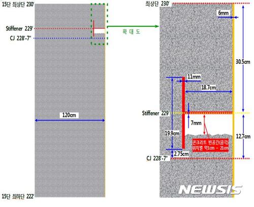 방사능 누출사고를 막는 마지막 차단벽인 1.2m 두께의 콘크리트 방호벽 안쪽에 길이 18.7㎝, 직경 1㎝~21㎝ 크기의 구멍이 생겼다는 것이다.
