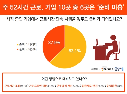 2일 취업포털 인크루트와 아르바이트 O2O플랫폼 알바콜이 중소, 중견, 대기업 등 351개 기업을 대상으로 주 52시간 근로제에 대해 설문조사를 시행한 결과, 기업 10곳 중 6곳 이상에서 준비가 미흡하다고 답했다.