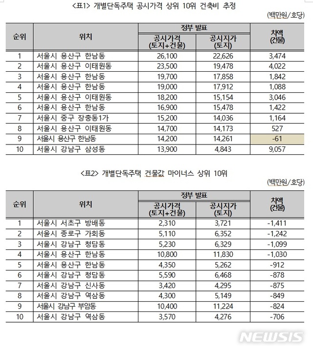 경제정의실천시민연합(경실련)은 올해 기준 최고가 단독주택 70곳의 공시가격(땅값+건물값)과 공시지가(땅값)을 비교한 결과 절반이상이 공시가격에 건물값이 제대로 반영되지 않고 있다고 11일 밝혔다.