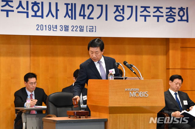 【서울=뉴시스】박미소 수습기자 = 22일 오전 서울 서초구 현대자동차 본사에서 열린 '제51기 정기 주주총회'에서 의장인 이원희 현대자동차 사장이 참석하고 있다.2019.03.22.