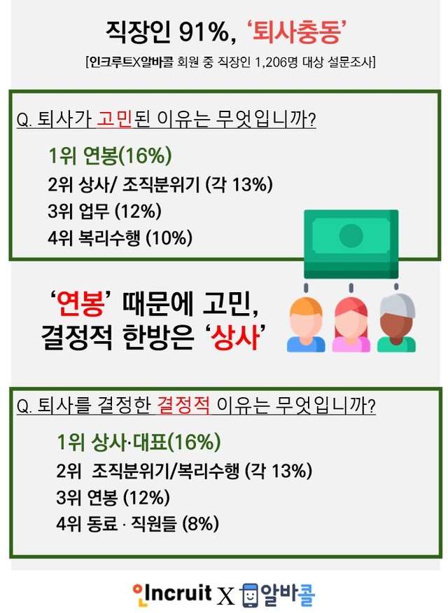 퇴사가 고민된 이유에는 '연봉'이 가장 많이 꼽혔지만, 최종 퇴사를 결심하게 되는 가장 큰 요인은 '상사·대표'가 결정적인 것으로 조사됐다.