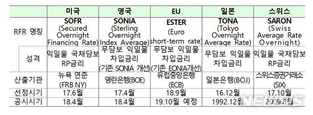 리보 해당국인 영국, 유럽연합(EU), 일본 등은 풍부한 유동성 등을 고려해 무담보 익일물 콜금리를, 미국과 스위스는 환매조건부매매(RP) 금리를 무위험 지표금리로 채택했다. 리보 해당국이 아닌 호주·브라질·싱가프로 등도 무위험 지표금리를 확정했고, 캐나다·멕시코·홍콩·남아프리카공화국 등은 선정 작업을 진행 중이다.