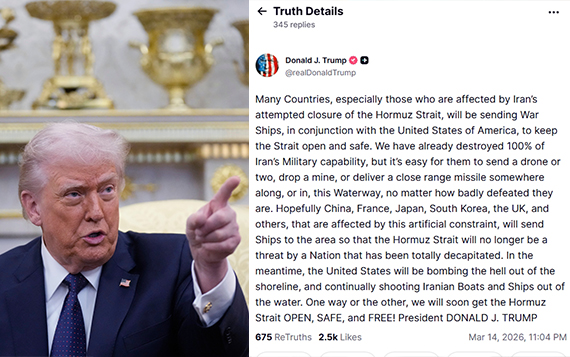 도널드 트럼프 미국 대통령은 14일(현지시간) 한국과 중국, 일본, 영국, 프랑스 등 여러 나라에 이란으로부터 호르무즈 해협이 위협 받지 않도록 선박을 보내달라고 요구했다. 트럼프 대통령이 예고한 미국 군함 파견에 보조를 맞추라는 압박으로 풀이된다. 트럼프 대통령은 이날 소셜미디어 트루스소셜에 "이란의 호르무즈 해협 봉쇄 시도로 인해 영향을 받는