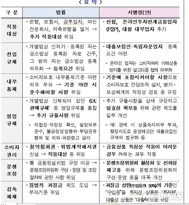 개정안은 금융소비자보호체계가 은행법 등 개별 금융업법으로 규율하던 기관별 규제방식에서 기능별 규제방식으로 전환한 것이 특징이다. 법 적용대상은 금융상품의 직접판매업자, 판매대리·중개업자, 자문업자다. 금융상품은 법에서 은행 예금·대출, 보험, 금융투자상품, 신용카드 등을 열거했고, 시행령에 추가할 수 있도록 위임했다.