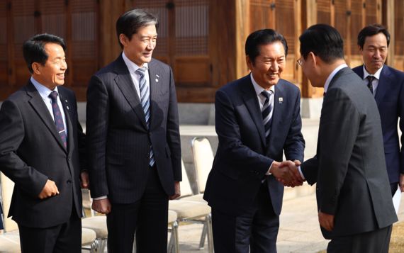이재명 대통령이 19일 더불어민주당 정청래 대표와 한병도 신임 원내대표 등 여당 지도부를 청와대로 초청해 만찬을 함께하며 '당정청 원팀'을 강조하며 국정과 민생 전반에 관해 의견을 나눴다. 이 대통령은 이날 청와대 본관에서 오후 6시부터 오후 8시40분까지 민주당 지도부와 만찬 회동을 갖고 이같이 밝혔다고 박수현 민주당 수석대변인이 서면 브리핑을 통해