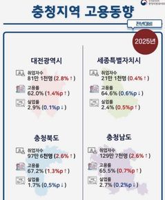충북이 지난해 충청권에서 가장 높은 고용률과 가장 낮은 실업률을 기록한 것으로 나타났다. 14일 충청지방데이터청에 따르면 2025년 충북의 고용률은 67.2%로 전년 동기 대비 1.3%p 올랐다. 충남(65.5%), 세종(64.6%), 대전(62.0%)을 포함한 충청권에서 가장 높은 수치다. 성별로는 남자가 0.2% 오른 74.7%, 여