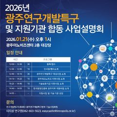 연구개발특구진흥재단 광주연구개발특구본부(본부장 서동경)는 오는 21일 오후 1시 30분 광주이노비즈센터 대강당에서 2026년 광주연구개발특구·지원기관 합동설명회를 개최할 예정이라고 19일 밝혔다. 이번 설명회는 광주특구 입주기업과 지역 혁신기업을 대상으로 2026년도 광주연구개발특구육성사업(R&D) 및 유관 지원사업을 종합적으로 안내하고 기