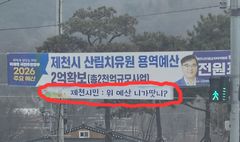 거리에 넘쳐나는 정치 현수막에 관한 논쟁이 뜨거운 가운데 충북 제천에 이를 조롱하는 '댓글 현수막'이 내걸려 눈길을 끈다. 22일 정치권에 따르면 더불어민주당 전원표 제천·단양 위원장은 산림청의 제천산림치유원 사업타당성조사 연구용역비 편성을 환영하는 현수막에 도심에 내걸었다. 산림청은 제천시 청풍면 학현리에 국립산림치유원을 짓기로 하고 내년도